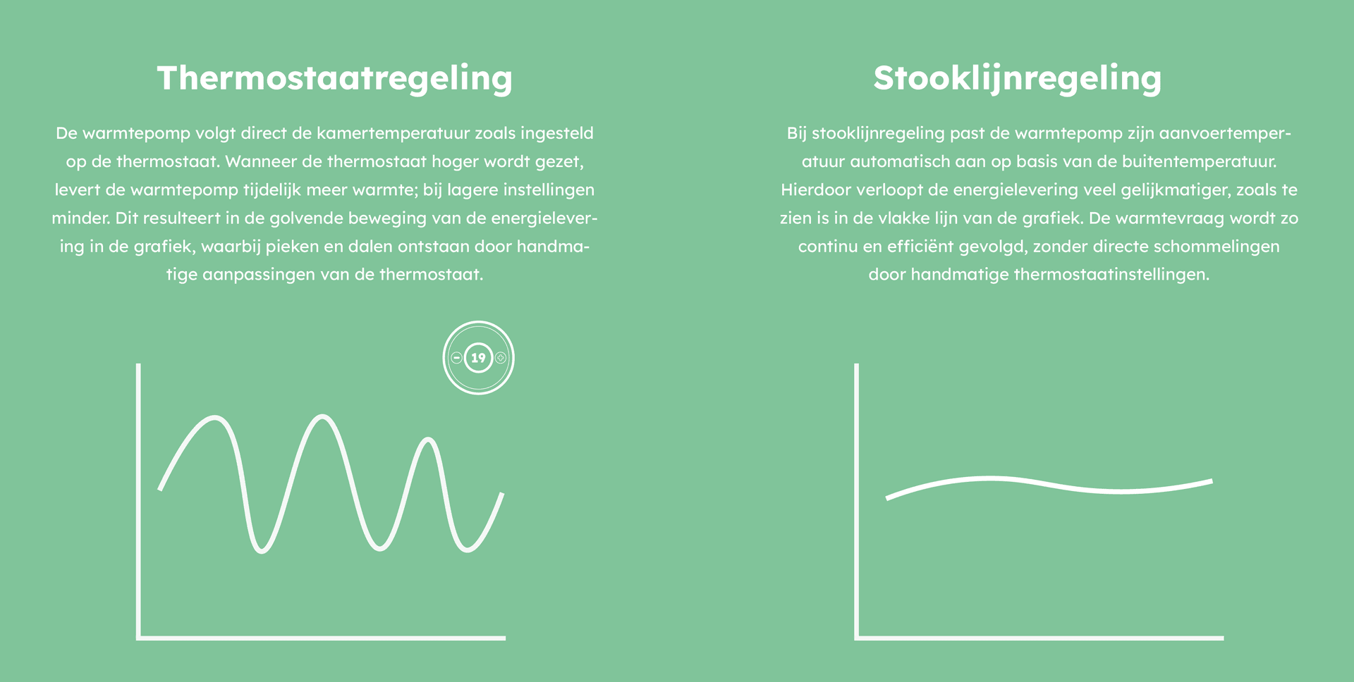 Een stooklijnregeling vraagt in het begin wat aandacht. Je kijkt hoe het comfort aanvoelt en stelt de lijn zo nodig iets bij. Zodra de juiste instelling is gevonden, regelt de warmtepomp de verwarming grotendeels zelfstandig en heb je er weinig omkijken naar.